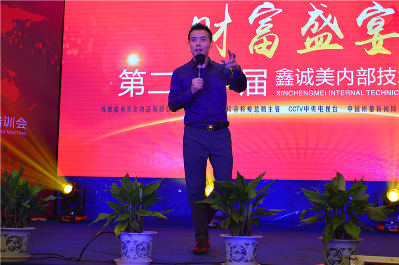 緊接著,我們英俊瀟灑的楊鑫總經(jīng)理致辭.他是成都鑫誠(chéng)美化妝品有限公司的締造者.是廣州軒源GMP生產(chǎn)工廠(chǎng)股東.美業(yè)資源營(yíng)銷(xiāo)實(shí)戰(zhàn)專(zhuān)家